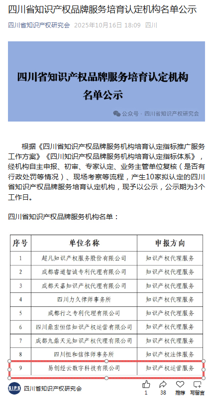 近日,四川知識(shí)產(chǎn)權(quán)研究會(huì)官網(wǎng)發(fā)布了《四川知識(shí)產(chǎn)權(quán)品牌培育認(rèn)定機(jī)構(gòu)名單公示》。根據(jù)《四川知識(shí)產(chǎn)權(quán)品牌服務(wù)機(jī)構(gòu)培育認(rèn)定指標(biāo)推廣服務(wù)工作方案》《四川知識(shí)產(chǎn)權(quán)品牌服務(wù)機(jī)構(gòu)培育認(rèn)定指標(biāo)體系》,經(jīng)機(jī)構(gòu)自主申報(bào)、初審、專家認(rèn)定、業(yè)務(wù)主管單位復(fù)核、現(xiàn)場考察等流程,全省10家公司入選,易創(chuàng)經(jīng)云數(shù)字科技有限公司名列其中。